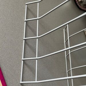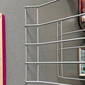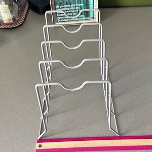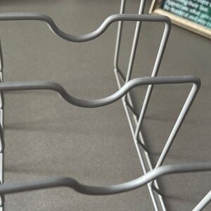 Gray coated wire rack organizer. Perfect for kitchen or office use. 8”x 10” Great for Organizing kitchen lids pans or cutting boards. Office, store files or books. 2 1/4 inches between each metal coated bar.