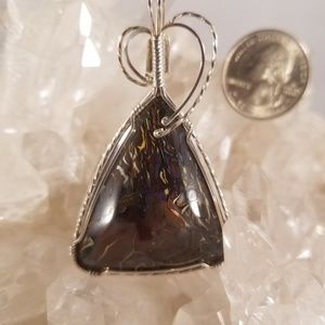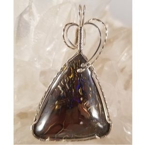 This beautiful Australian Koroit Opal is wire wrapped in Silver to create a stunning statement pendant. The stone itself measures 36mm x 33mm and the bale has a max opening of 6mm. Beautiful blues, unique pattern and super deep ironstone.