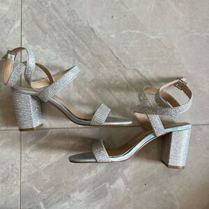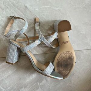 Sparkly Silver heels. Gently used once and in great condition. Wrap around the ankle