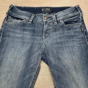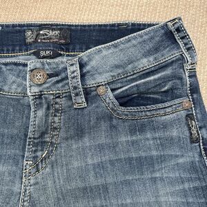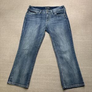 Y2K low rise Silver Jeans Co. stretch denim bootcut Capris Suki style distressed wash embellished pockets
