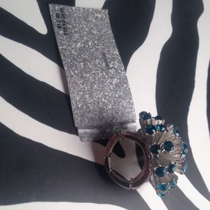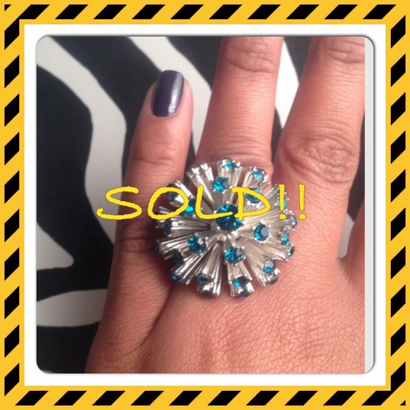 Silver adjustable ring with teal rhinestone accents. In a starburst kind of pattern.