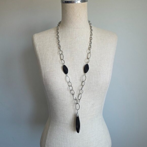 This necklace features a striking combination of silver and black. Its modern design adds a touch of elegance to any look.