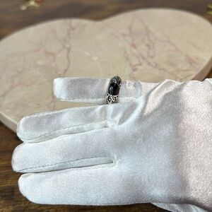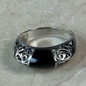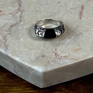 Elegant silver ring featuring a black center with intricate detailing. Perfect for adding a touch of sophistication.
