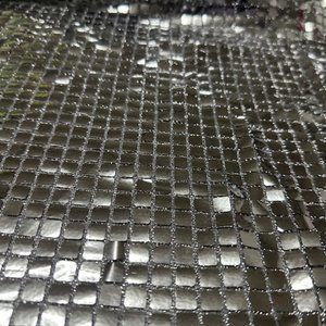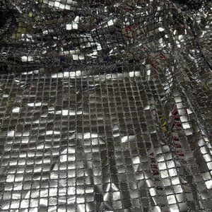 Silver and Black Sequence Fabric. 62% Nylon, 17% metallic. 44 inches wide. 3 1/3 yards.