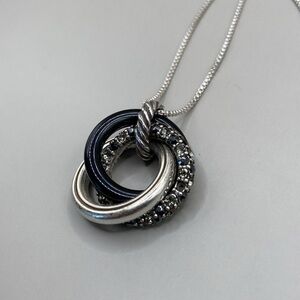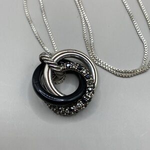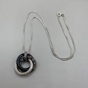 Silver and Black and Black Gemstone triple circle necklace on 18 inch box chain. Good condition, minimal wear. Not stamped, so I'm not sure of the metal or brand, but does feel more like costume jewelry.