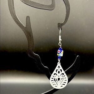 These exquisite earrings feature a stunning silver teardrop design, accented with vibrant blue cube beads. The intricate cut-out pattern adds a touch of elegance, making them perfect for any occasion.