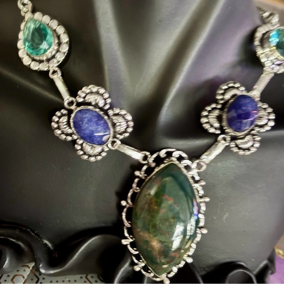 This exquisite necklace features deep blue cabochon gemstones set in a detailed silver filigree design. The intricate craftsmanship and vibrant colors make it a standout piece, perfect for adding a touch of elegance to any outfit.