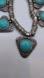 This stunning necklace features a silver-toned chain adorned with five teardrop-shaped pendants, each showcasing a vibrant blue stone set in ornate silver. The intricate detailing and vintage look of the silver elements enhance the overall Southwestern-inspired design. Perfect for adding a touch of elegance to any outfit.