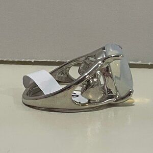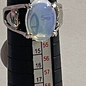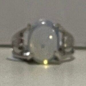 This stunning silver ring features a large oval-shaped gemstone at its center, exuding a soft ethereal glow with hints of pale blue. Flanking the central stone are two smaller decorative elements that enhance its elegant design. The overall aesthetic is classic and sophisticated, making it a perfect addition to any jewelry collection.