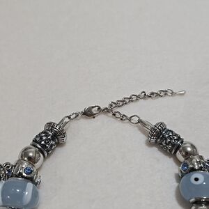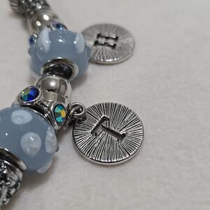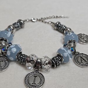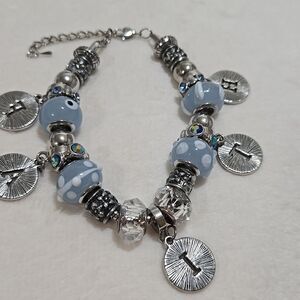 Elegant silver and blue glass beaded charm bracelet with intricate charms spelling FAITH