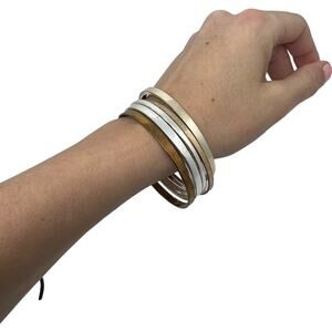 This elegant silver and copper tone bangle bracelet set combines the beauty of two metals, creating a striking, versatile accessory. In excellent condition, the set measures approximately 8 inches in circumference, providing a comfortable fit for most wrist sizes. The perfect balance of silver and copper tones adds a sophisticated touch, making this set ideal for both casual and formal occasions.