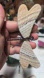 Elegant dragonfly carving with silver body and cream tan and black striped wings. 5" from wing tip to wing tip.