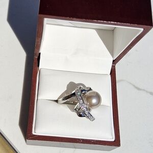 This knotted ring features a 4mm band width made of lead-free alloy (brass) with a stunning 2.40 carat weight. Made of a lead-free alloy (brass) with a rhodium plating. This ring features a 12mm simulated pearl and a 2mm round white sapphire. With dimensions of 15mm L x 23mm W x 14mm H. Believed to be a simulated gemstones