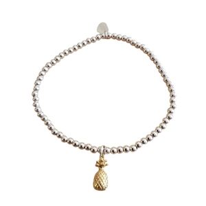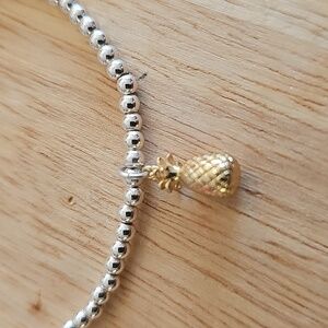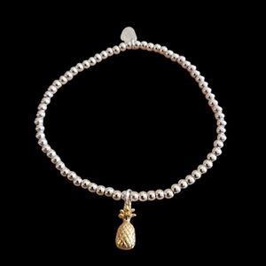 Elegant silver beaded stretch bracelet. Features a gold pineapple charm. Perfect for any occasion.
