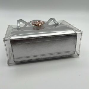 Stuart Weitzman, PVC top handle bag. Silver insert, complete with a charming heart-shaped accent on the pvc exterior.. Its structured, boxy shape and transparent elements offer a modern and minimalist aesthetic, perfect for showcasing your essentials with flair. Condition is pre owned, please see photos.