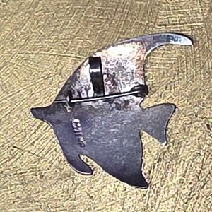 This exquisite brooch features a stylized angelfish design, showcasing a vibrant green body with elegant silver and blue detailing. The piece captures the essence of a tropical reef fish with its angular shape and flowing fins, making it a standout accessory for any occasion.