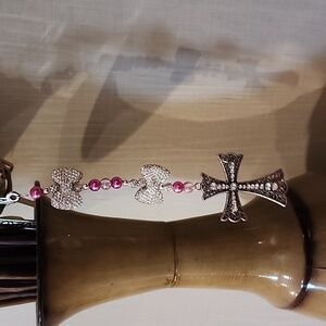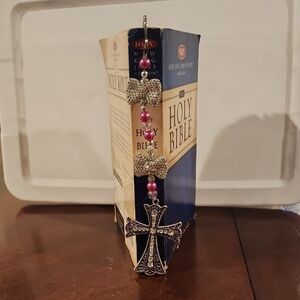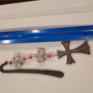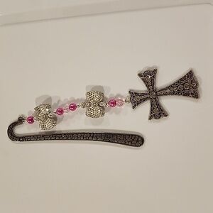 Elegant bookmark with a silver cross and pink beads. Perfect for adding a touch of style to your reading.