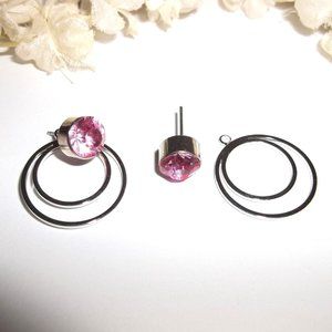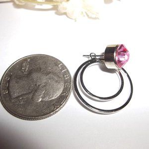 These pre-owned ear jacket costume jewelry earrings are so edgy and trendy. Some people call these peek a boo earrings. They are silver toned costume jewelry. They have sparkly pink rhinestones and double circle designs. The post stud pink earrings are circle shaped and removable, and you could wear those all by themselves to change up your look. The pink part measures 3/8 inches round. The circle jackets that can be worn with them peek around the bottoms of your ears and give them that edgy vibe. Both circles and pink parts together measure 1 inch tall and 3/4 inch wide. Each single earring with the jacket included weighs 2.4 grams. Lightweight! Buy them now before someone else does!