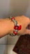 Elegant silver bracelet featuring vibrant red charms and a heart pendant. Perfect for adding a touch of color to any outfit.