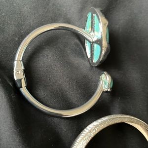 One is spring opening and other is slip over wrist. I don’t know maker or quality but I am pretty sure the turquoise one is simulated. Silver bangle looks like it has a welded closure as shown in last pic.