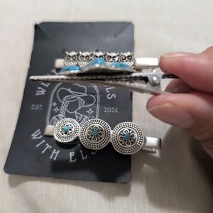 Enhance your hairstyle with this elegant silver and turquoise hair clip set. Perfect for adding a touch of sophistication to any look.