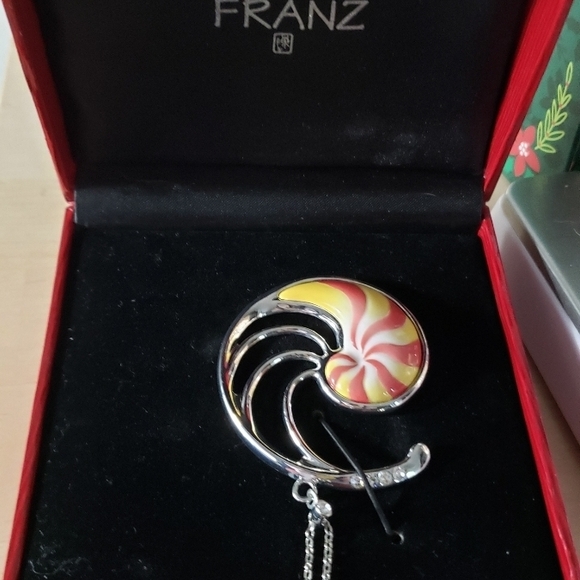 Elegant silver brooch with a vibrant yellow accent crafted by Franz Collection. Perfect for adding a touch of sophistication to any outfit. With original box.