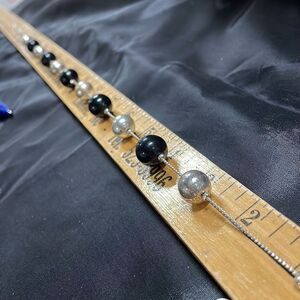 Silver and black beads on silver chain with matching drop earrings, 17-20 inches