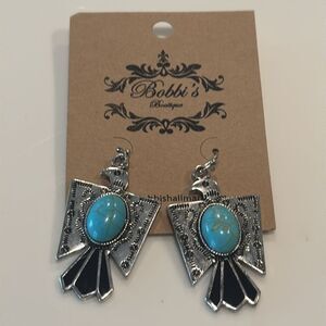 Elegant silver earrings featuring a striking faux turquoise stone. Perfect for adding a touch of sophistication to any outfit.