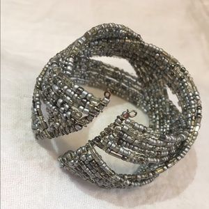 Silver beaded braided bracelet. Opens and closes to desired position. Fits wrists 6-8 inches.