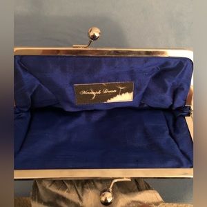 Like new, used once Silver fabric material with bow design Silver snap opening Blue fabric interior