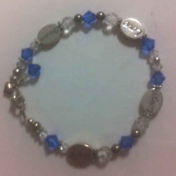 Sterling silver bracelet. Blue and clear beading. Live, laugh, love, dream.