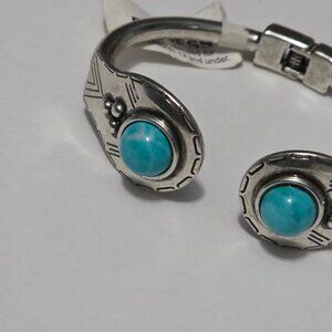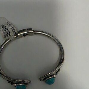 Embrace timeless elegance with this stunning silver bracelet, beautifully accented with vibrant turquoise stones. The cool, polished silver setting enhances the natural beauty of each turquoise stone, known for its captivating blue-green hue and unique character. Designed for both comfort and style, this bracelet offers a perfect balance of classic charm and contemporary flair. Whether worn alone or layered with other pieces, it adds a touch of sophistication and a pop of color to any outfit, making it a versatile accessory for any occasion.