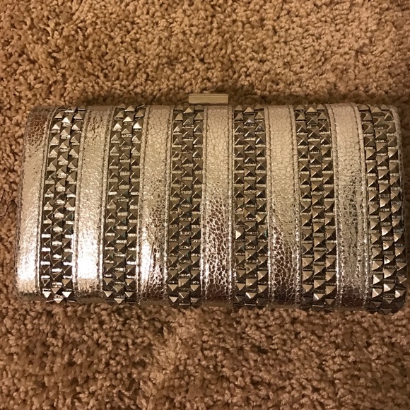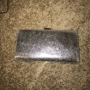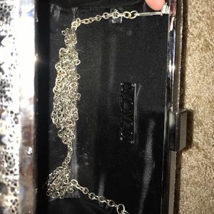 Dressy silver clutch. Outside is in perfect condition. There is a shoulder chain inside that's broken, but could very easily be repaired. Big enough to fit more than just phone and keys.