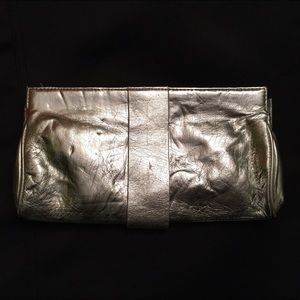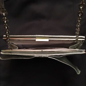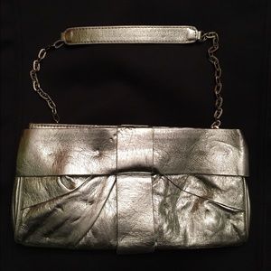 Fun silver (no name) bag that can either be used as a shoulder bag or clutch. Great for formal events or a night on the town! 9.5" length, 5" depth, 9" drop (handle)