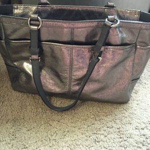 Shiny silver coach purse. Light use. Only stains are shown in pictures. I will try my best to get them out before I ship. Large zipper pocket and two phone size pockets inside. Two side pockets and one large pocket on back side.