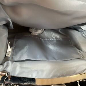 Bijoux TERNER Polyester Silver colored glam clutch with metal snap closure. Chain shoulder strap can be tucked inside or worn outside. NWT