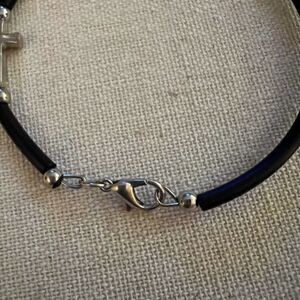 Silver detailed cross w pale blue crystal beads separated by gold beads. Black rubber detail pieces between silver beads. Silver lobster clasp. Vintage look. Excellent condition w no rips stains chips. 3” diameter - for larger wrist (7” +)