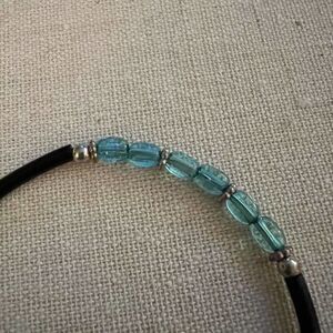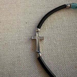 Silver cross and pale blue beaded bracelet w rubber cord and silver beads