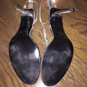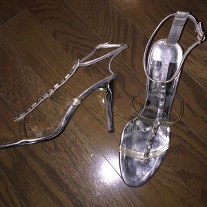 Silver 4 inch heel, lucite clear straps with front crystal down the front. (T-Strap) Nine West. Wore them once size: 9 1/2M These shoes are great for whatever. Weddings, cocktail parties. Very now with the clear lucite straps!