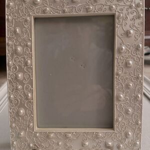 Exquisite champagne backed frame with Pearl deatails surrounded by silver crystals in a intricate scroll detail pattern. Crystal lining around frame border. Side is a silver brushed metal. Velvet backing. Excellent condition NWOT.