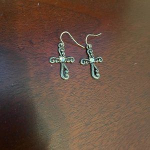 𝅺Silver dangle cross earrings with rhinestone in center
