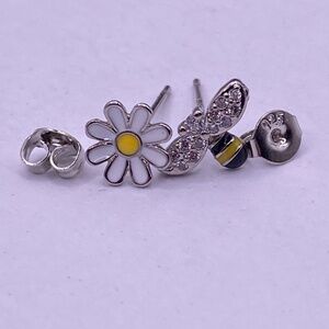 This is an adorable pair of Honey bee and daisy stud earrings. The earrings are 925 silver and enamel. The bee has crystals set in it. These are very small and perfect for everyday. The workmanship is excellent on these.