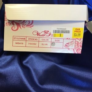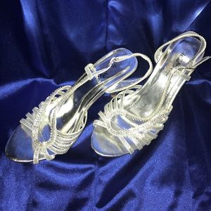 Stunningly romantic silver sparkly heels that are perfect for any formal event, date night, or to wear when you're watching Netflix. 3ish inch heel.