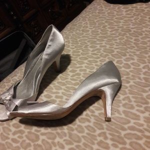Tall silver heels with silver bow. Worn once to a wedding. Size 7M. New condition. Leather soles. Originally $60.