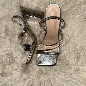 Strappy silver heels. Square toe. Size 8. Never worn.