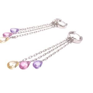 Women’s female Silver tone huggy hoop earring with long dangle shoulder duster drop chains pink, purple and yellow lass tear drop bead accents. See pictures for measurements. New with tags