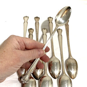 Vintage silverplated iced tea spoons - a matching set of 8 by Rogers & Bros in the Daybreak/Elegant Lady pattern produced circa 1952. Lovely mid century floral design - clearly hallmarked - light tarnish overall but no damage or flaws. In excellent vintage condition - the perfect stir!