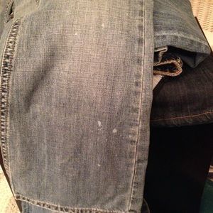 Light wash mfg distressed, the front of the left leg has little lighter spots and the back right leg.. I purchased them that way- I did post pics.. But just so it's noted there is distressed patterns. Also there is Some AFTER purchase wear in the bottom hem as shown in photos