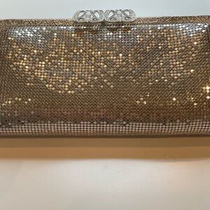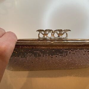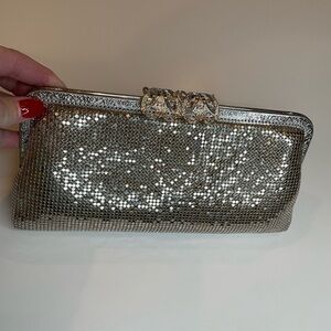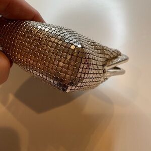 Silver metal mesh clutch with silver detail clasp. Padded satin interior. Missing the chain but you can ad your own easily.