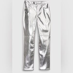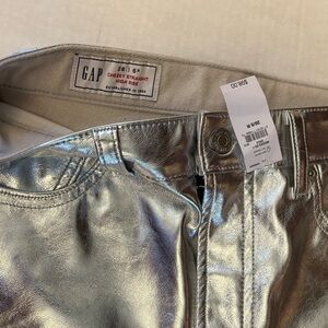 Gap cheeky straight leg high rise vegan leather silver jeans 100% poly w/zip fly closure. New with tags. These look gray in pics but they are truly silver like stock pics.